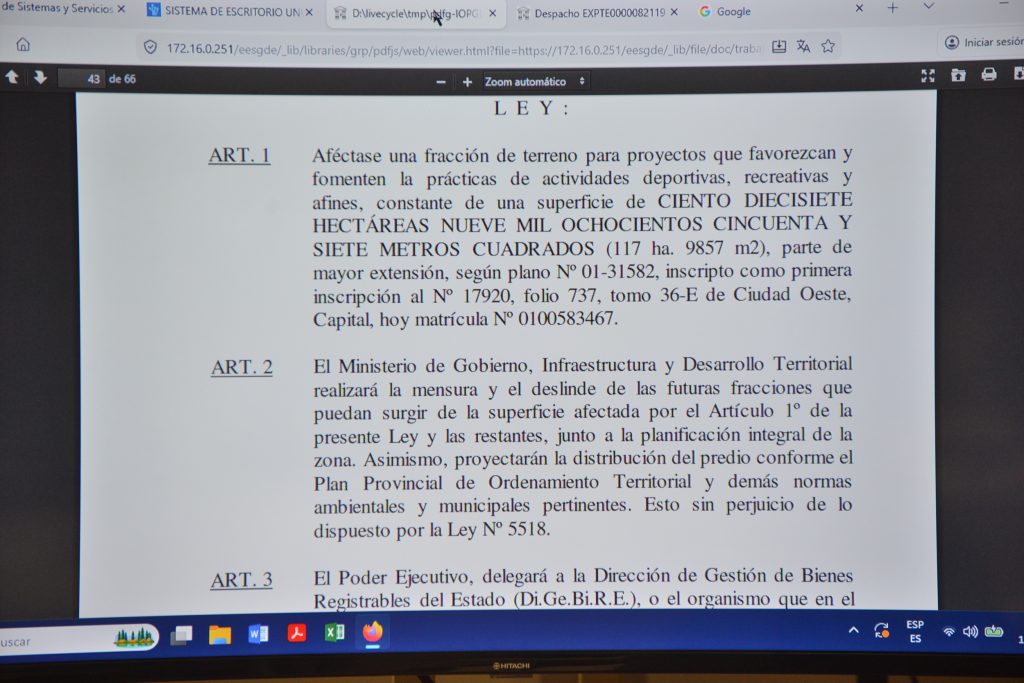 El articulado establece que el Ministerio de Gobierno, Infraestructura y Desarrollo Territorial será el encargado de realizar la mensura, el deslinde y la planificación integral del predio, conforme al Plan Provincial de Ordenamiento Territorial y la normativa ambiental vigente.