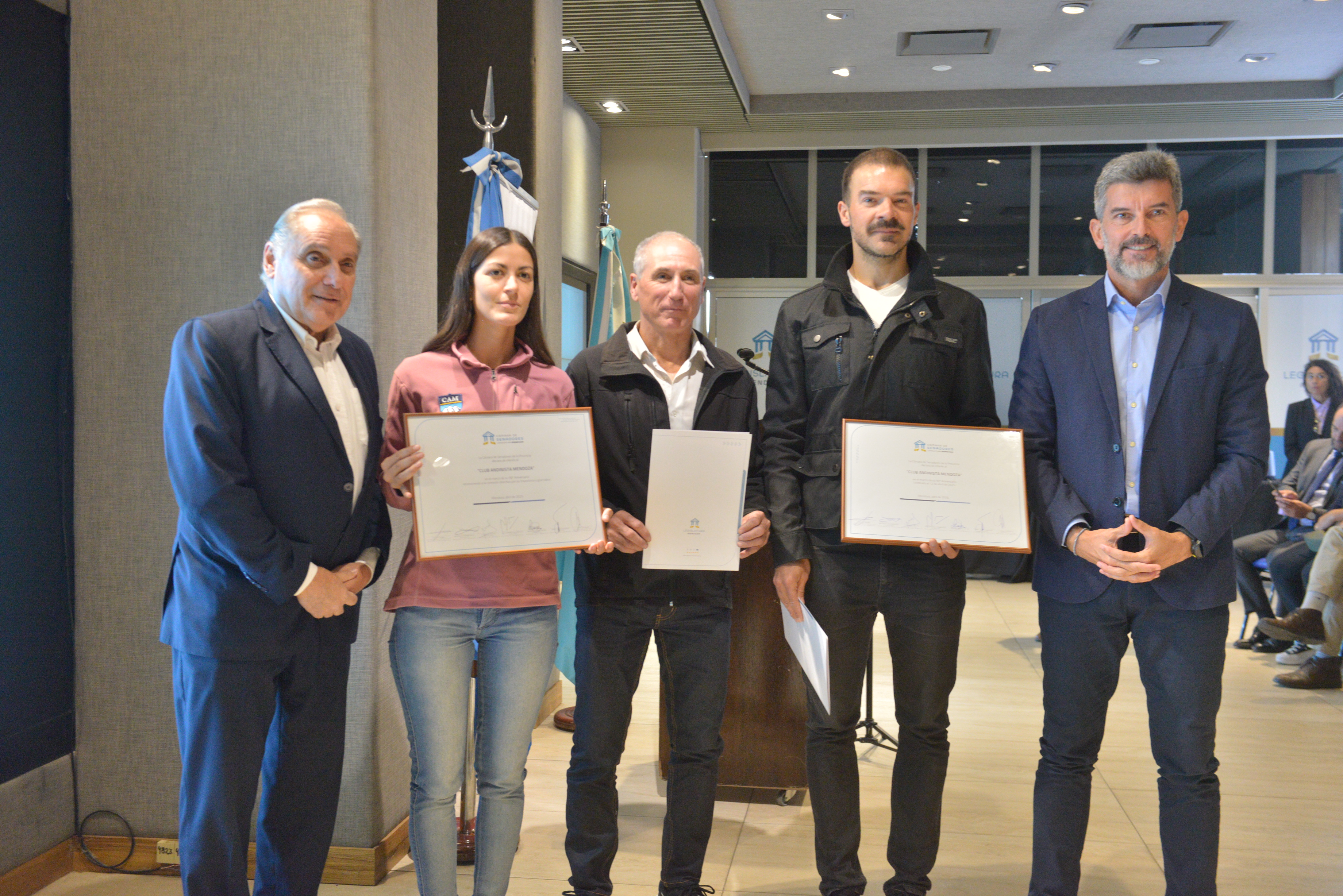 En la Legislatura Provincial, se desarrolló el acto de declaración de interés al Club Andinista Mendoza (CAM). La iniciativa fue llevada a cabo por los senadores Abel Freidemberg, Claudia Najul, Natacha Eisenchlas, Alejandro Diumenjo y María Laura Sainz. De la actividad formó parte el intendente de la Ciudad de Mendoza Ulpiano Suarez, como así también el presidente de la CAM Horacio Cunietti, el vicepresidente de la entidad Pedro Estévez y David Florez, ex presidente, entre otros.